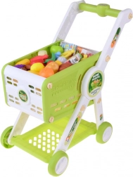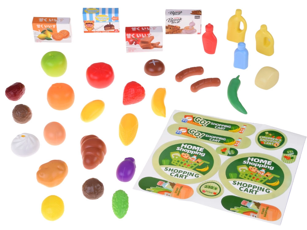 W komplecie owoce, warzywa, pieczywo, napoje, pudełeczka oraz naklejki. Dzieci mogą bawić się w realistyczne zakupy i sortowanie produktów.