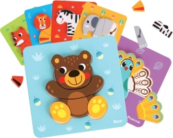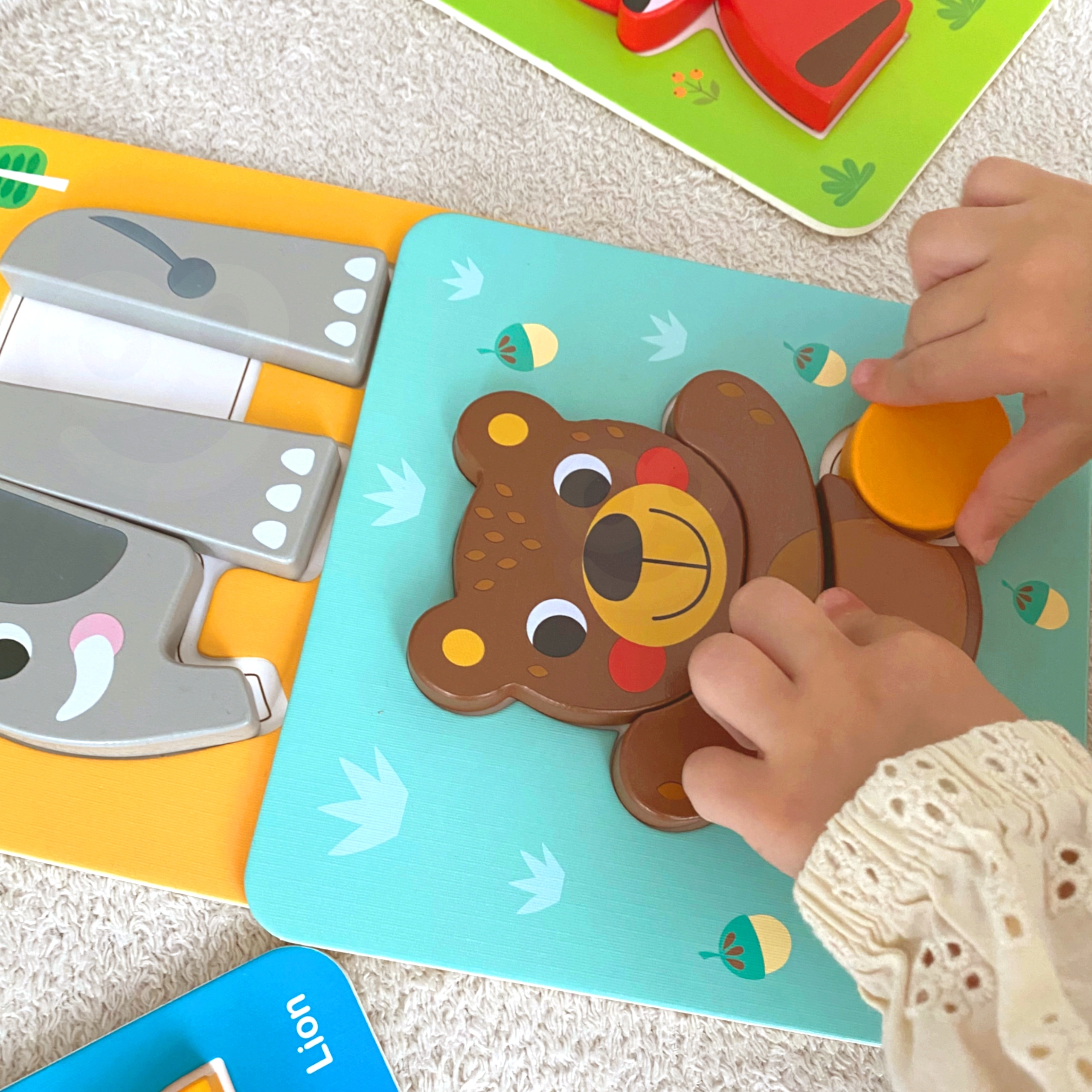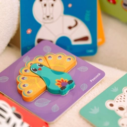 Ten zestaw Montessori oferuje dzieciom od 12 miesięcy bezpieczną i angażującą zabawę. Grube drewniane elementy, żywe kolory i tematyczne karty ze zwierzątkami zachęcają do układania i ponownego odkrywania. Każdy kształt dokładnie wpada w wyfrezowane kontury, co ułatwia koncentrację i wzmacnia koordynację ręka–oko.