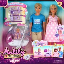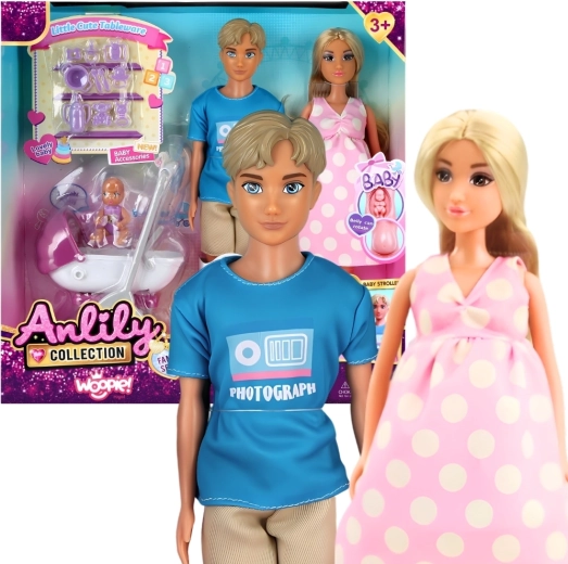 - Mama w ciąży z wyjmowanym niemowlęciem, tata, niemowlę, wózek, akcesoria (butelka, miseczka, smoczek, pieluszki, grzebień, talerzyk)