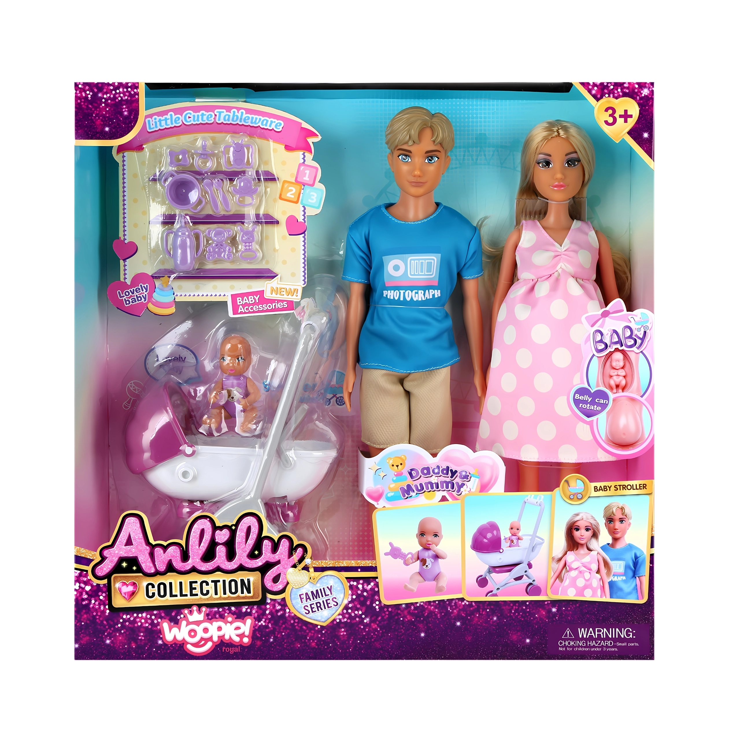 Rodzinny zestaw lalek marki Woopie zapewnia dzieciom godziny kreatywnej zabawy. Zawiera ciężarną mamę z wyjmowanym niemowlęciem, stylowego tatę, niemowlę, wózek oraz wiele akcesoriów do opieki. Wspiera empatię, zabawę w odgrywanie ról oraz rozwój wyobraźni.