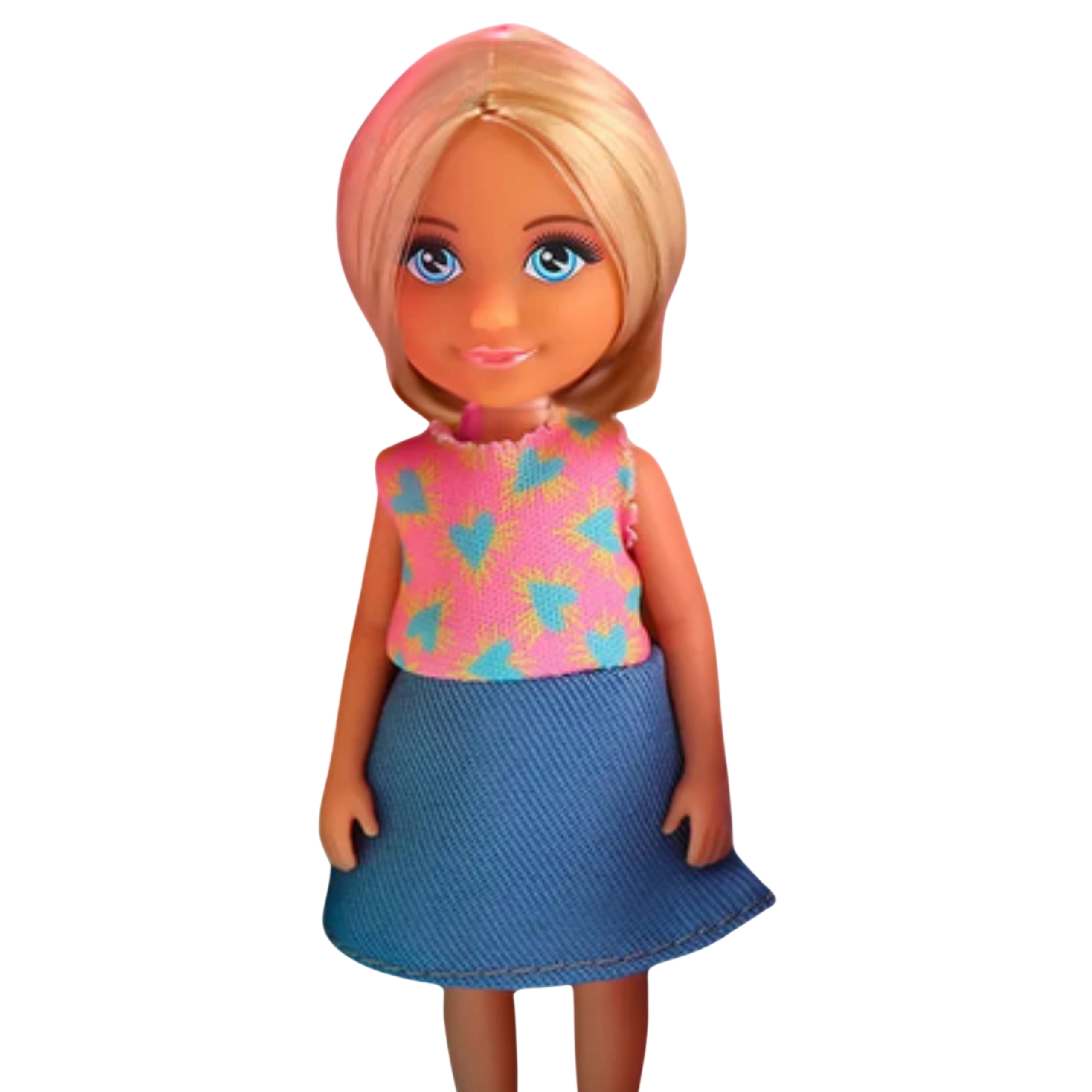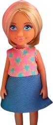 - Lalka z blond włosami w spódniczce i topie w serduszka.