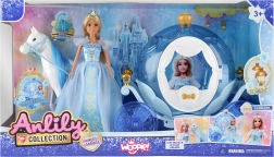 - Lalka księżniczka, koń, karoca (powóz), korona, torebka, naszyjnik