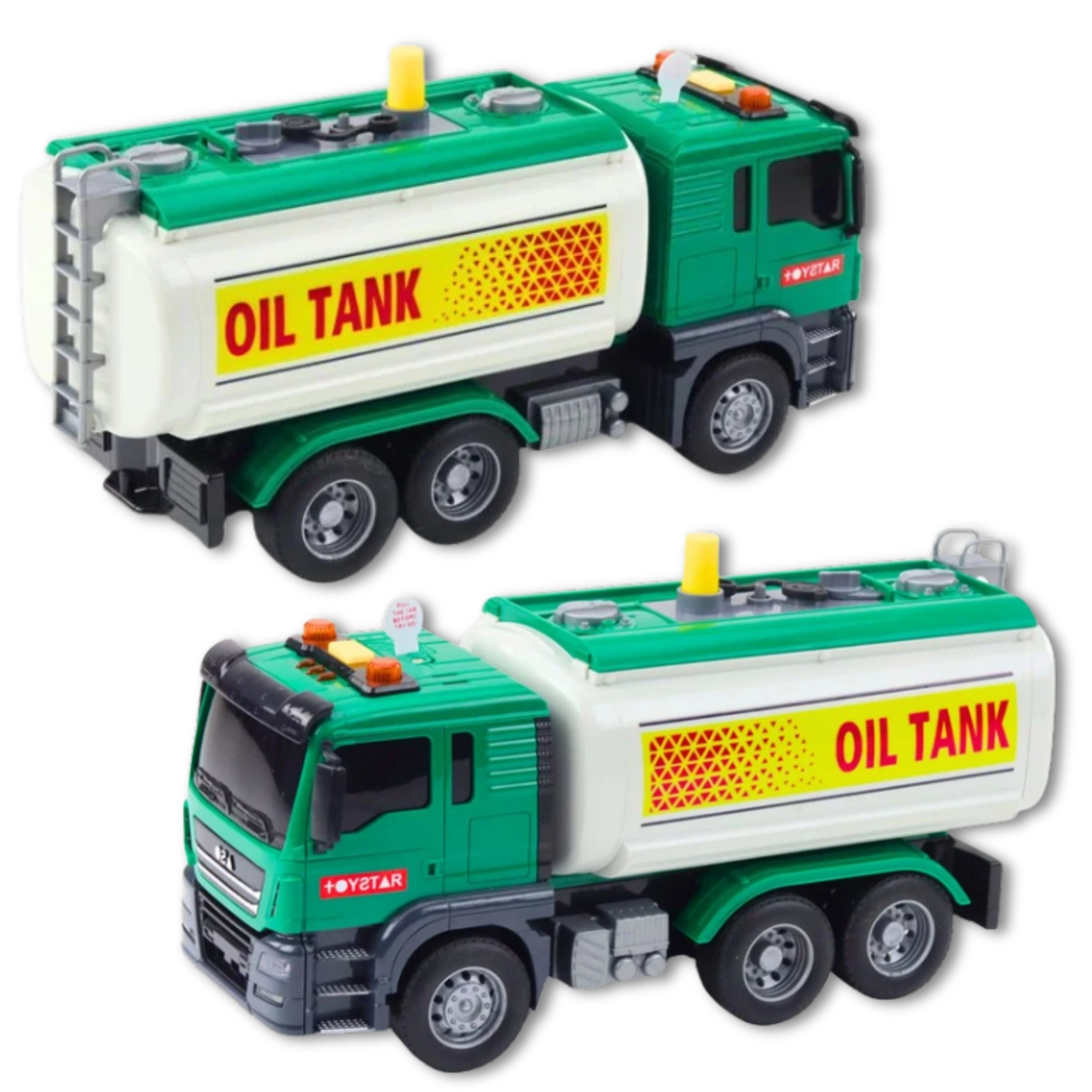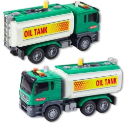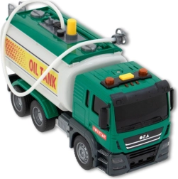 Ta zielona techniczna cysterna na wodę w skali 1:14 zapewnia dzieciom realistyczną zabawę. Wystarczy napełnić zbiornik, nacisnąć żółty przycisk pompki, a z węża popłynie woda – idealne do symulacji tankowania i dynamicznych scenariuszy zabaw. Na dachu kabiny znajdują się przyciski z efektami – klakson, cofanie i dźwięki silnika z towarzyszącymi migającymi światłami.