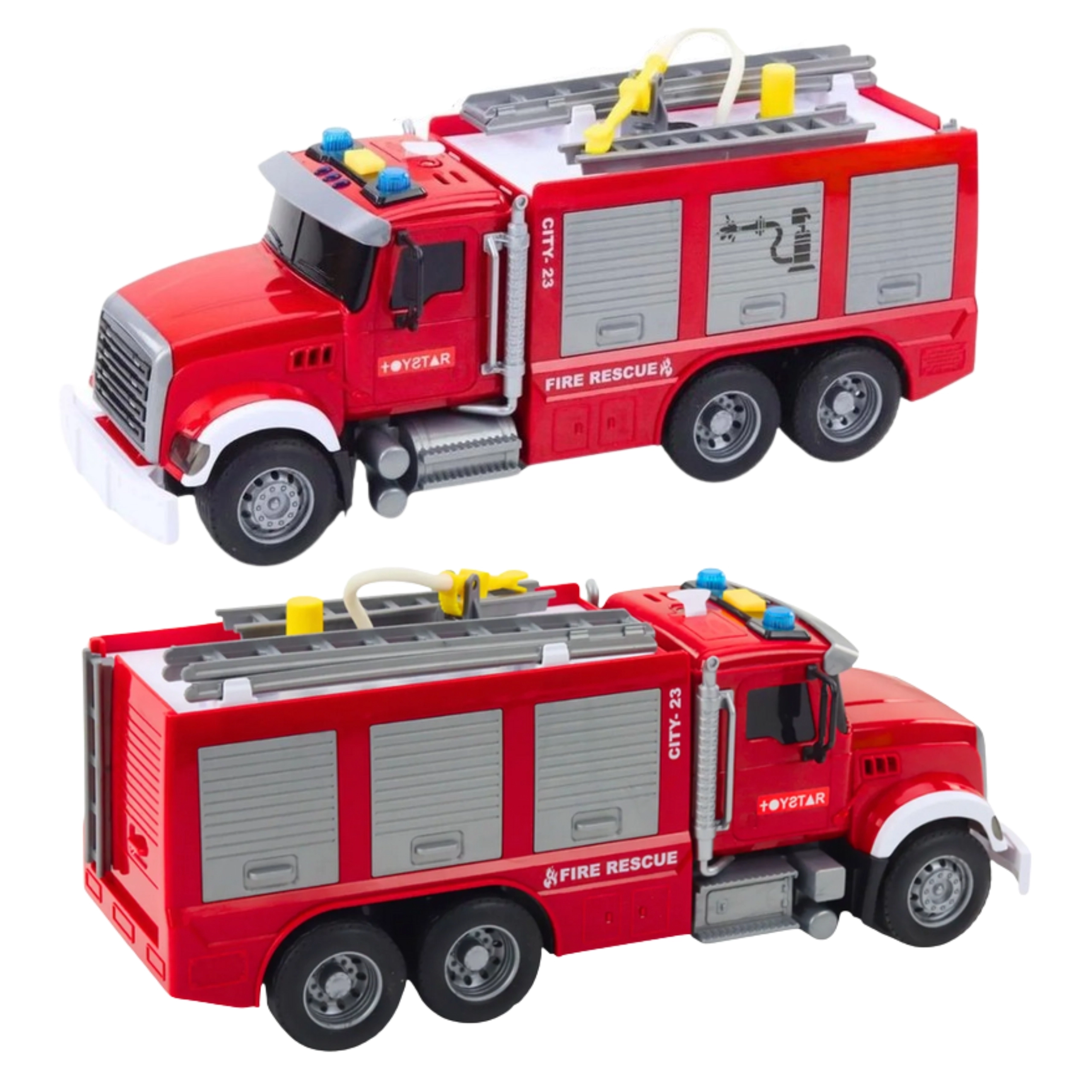 - Wóz strażacki z natryskiem wodnym, zbiornik na wodę, elastyczny wąż z końcówką, przycisk/pompka do pompowania, interaktywne przyciski świateł i dźwięków