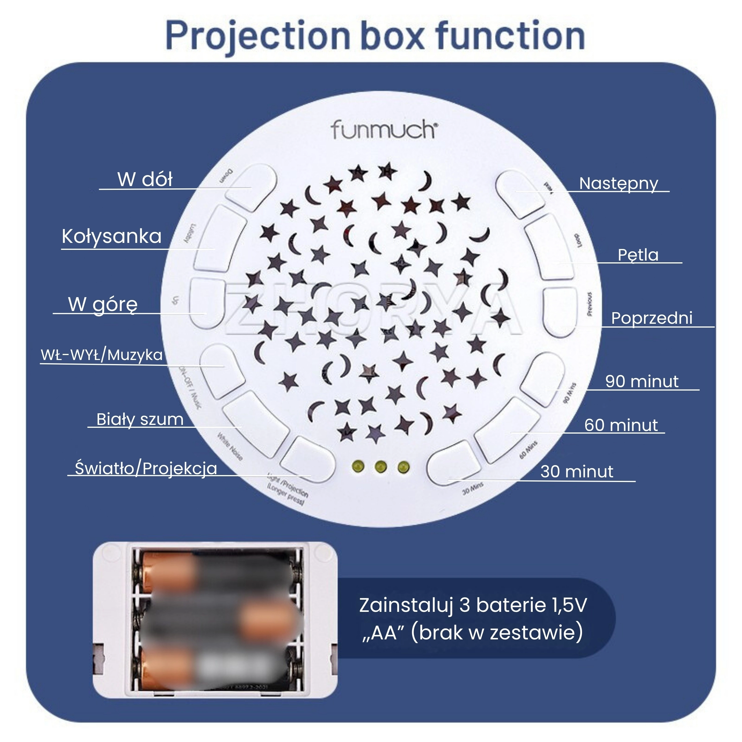• Projektor światła – delikatna projekcja gwiazd i księżyców dla wizualnego wyciszenia