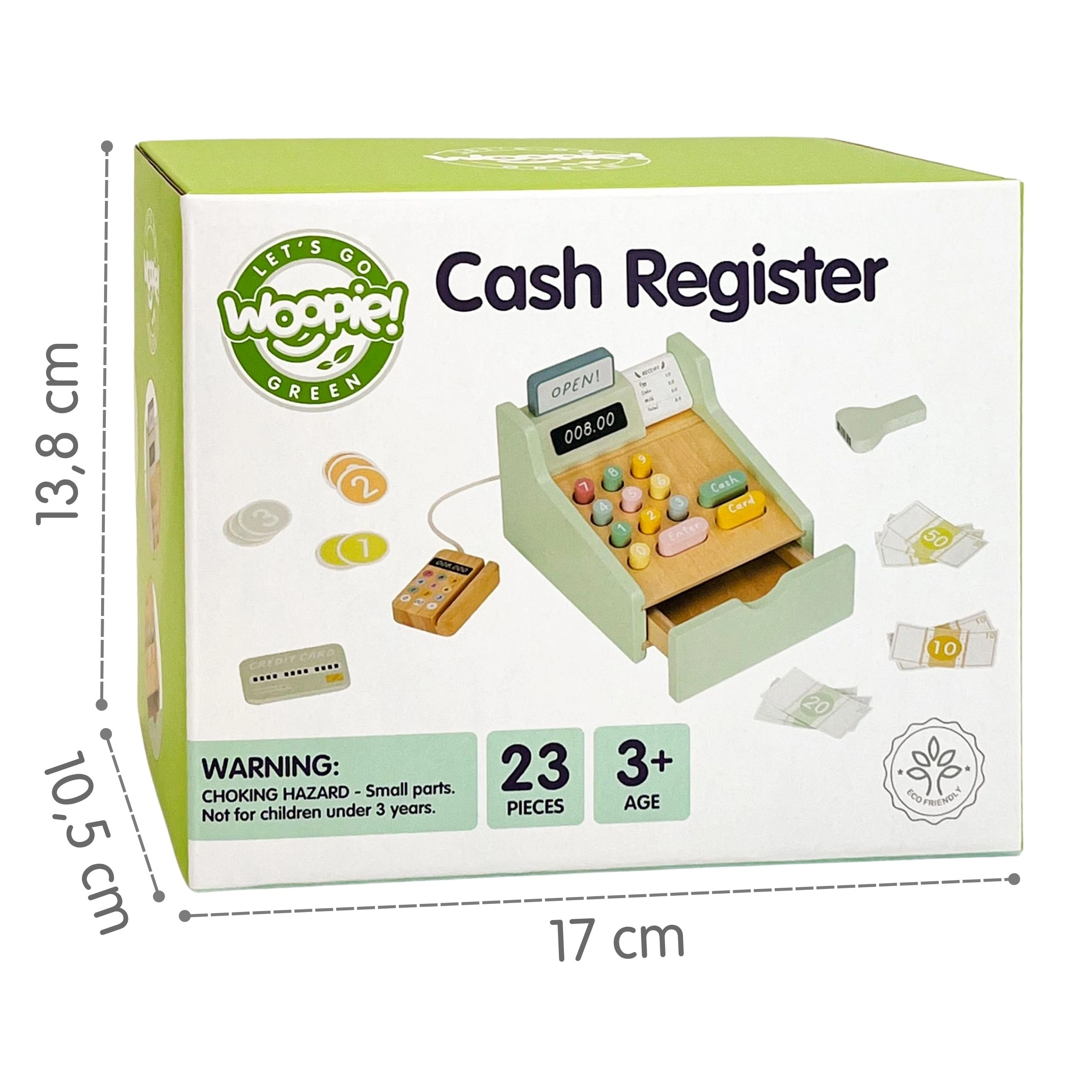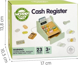 Drewniana kasa WOOPIE GREEN to idealna zabawka dla dzieci od 3 lat, które uwielbiają zabawę w sklep, kawiarnię lub restaurację. Dzięki funkcjonalnym elementom, takim jak wysuwana szuflada na pieniądze, skaner kodów kreskowych i czytnik kart płatniczych, dzieci w naturalny i przyjemny sposób poznają podstawy płatności i gospodarowania pieniędzmi.