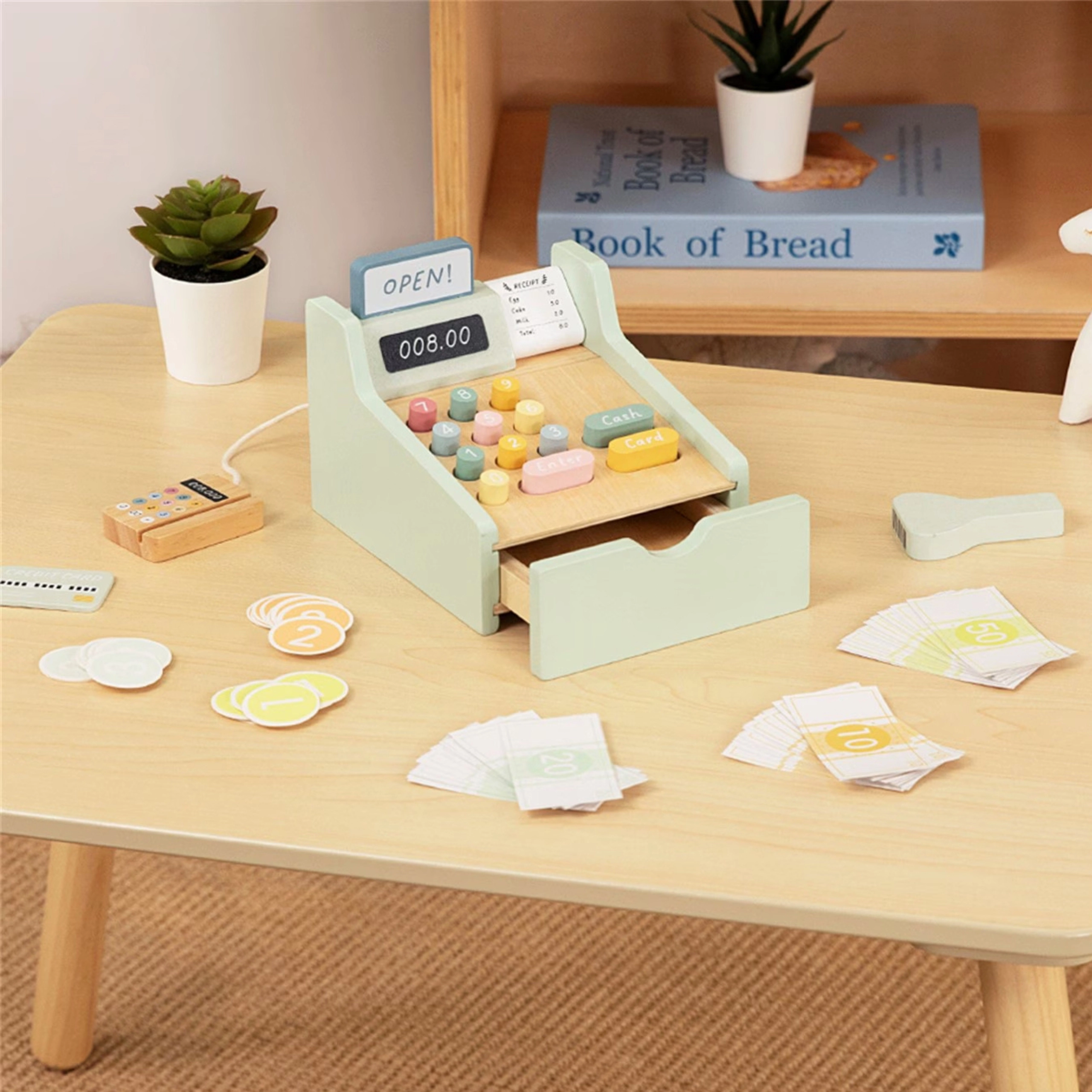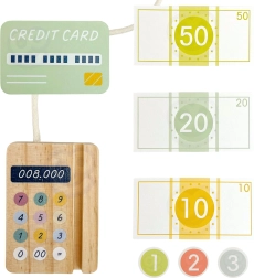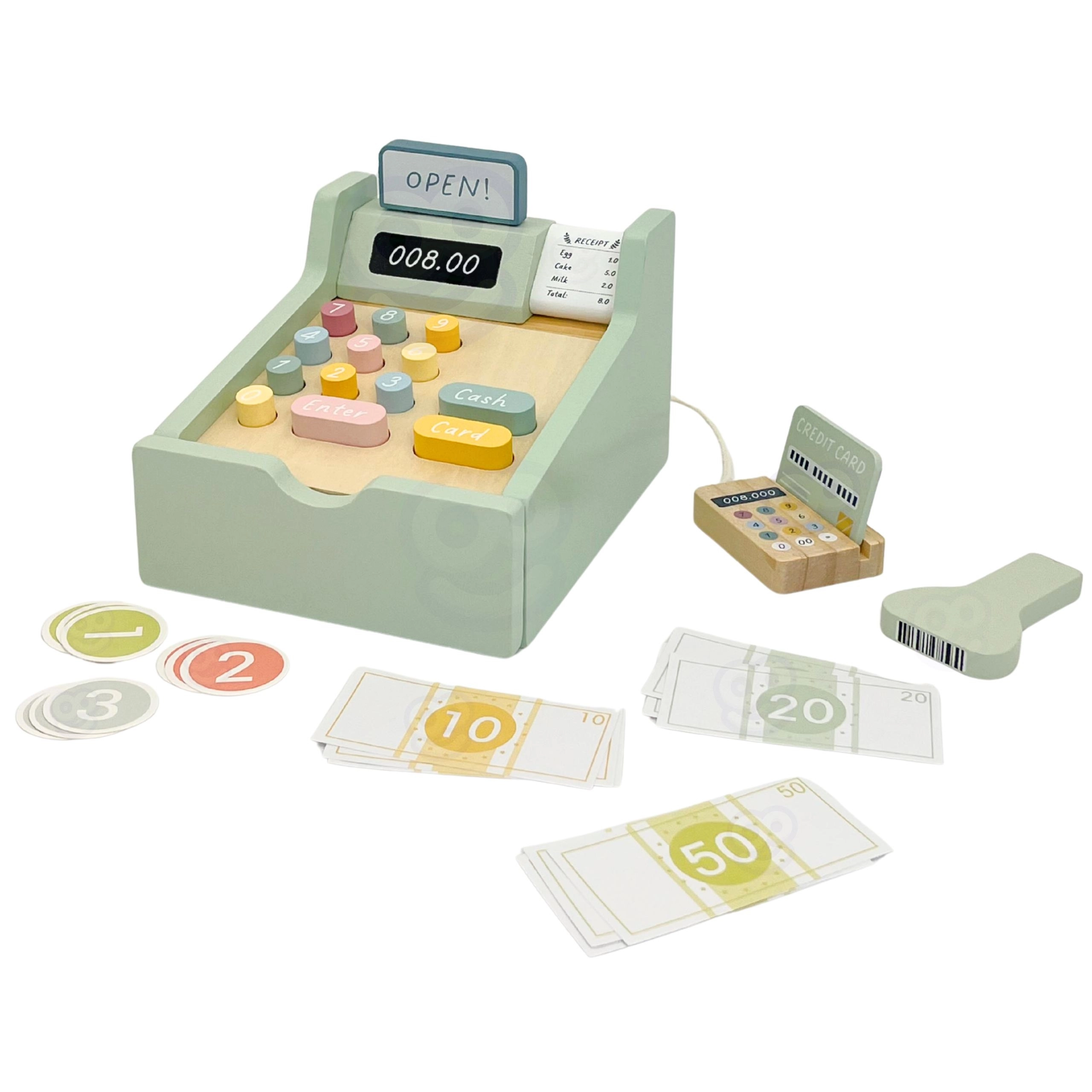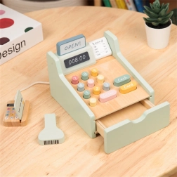Zestaw zawiera wszystko, czego potrzebuje mały sprzedawca: drewnianą kasę z kolorowymi przyciskami, skaner, czytnik kart, kartę płatniczą, monety i banknoty. Zabawa rozwija logiczne myślenie, umiejętności matematyczne, koordynację oraz komunikację podczas odgrywania ról sprzedawcy i klienta.