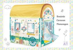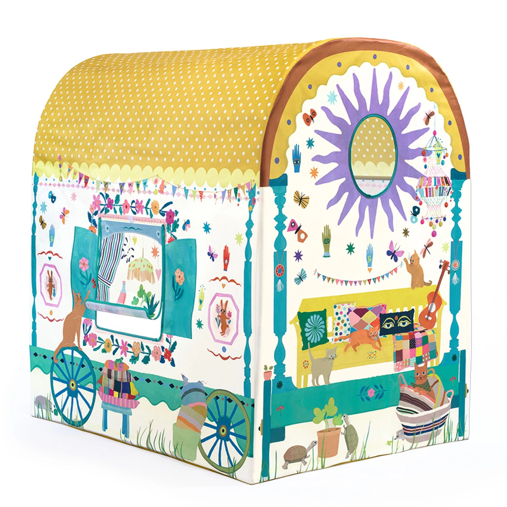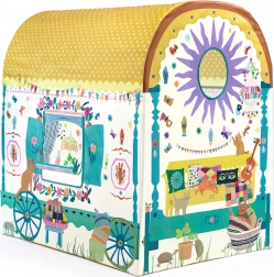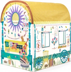 Ten przestronny namiot do zabawy DJECO w stylu karawanu oferuje dzieciom własny tajemniczy kącik do czytania, odpoczynku i pomysłowych zabaw. Dzięki zaokrąglonemu dachowi w kropki, drukowanym oknom i wesołym dekoracjom przypomina mały domek, który pięknie uzupełni każdy dziecięcy pokój.