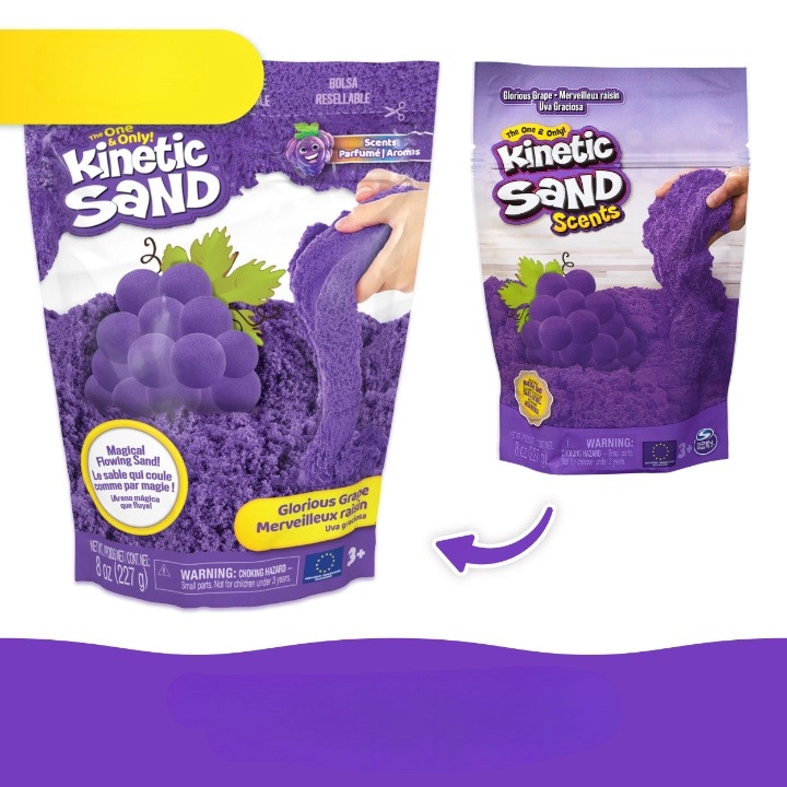 Kinetic Sand Scents zapewnia doznania sensoryczne: delikatny, plastyczny piasek o przyjemnym zapachu winogron, który dzieci pokochają. Specjalna formuła utrzymuje ziarna razem, dzięki czemu piasek mniej się sypie, a zabawa jest czysta i wygodna. Idealny do kreatywnej zabawy w domu – formuj literki, budowle, babki i fantazyjne wytwory.