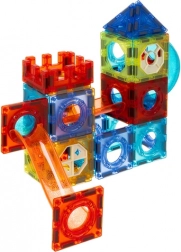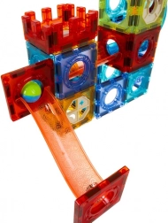 Przezroczyste panele łączą się pewnie dzięki silnym magnesom, więc wieże, mosty i rampy trzymają kształt, a zabawa przebiega bez zbędnych upadków.