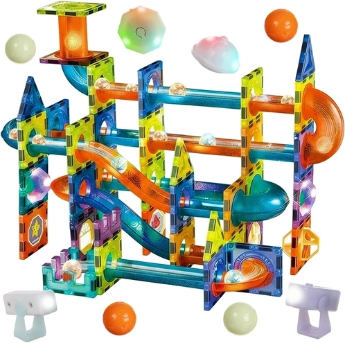 Magnetyczne klocki z torem kulkowym pozwalają dzieciom budować wieże, mosty i spiralne zjazdy oraz śledzić, jak kulki mkną przez przezroczyste tunele. Solidne połączenia magnetyczne zapewniają stabilność konstrukcji bez zbędnych przewrotek, a elementy LED zamieniają każdą budowlę w świetlny pokaz. W zestawie znajduje się kolorowa instrukcja krok po kroku, która ułatwia szybki start i inspiruje do kolejnych pomysłów.