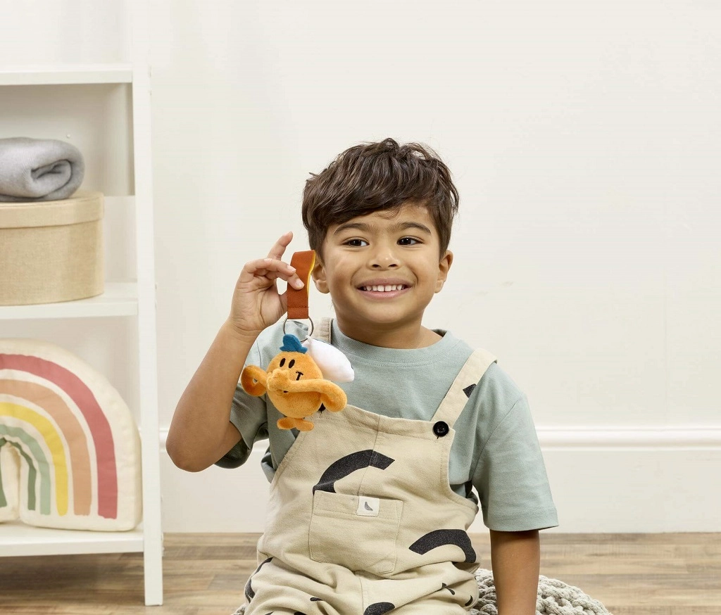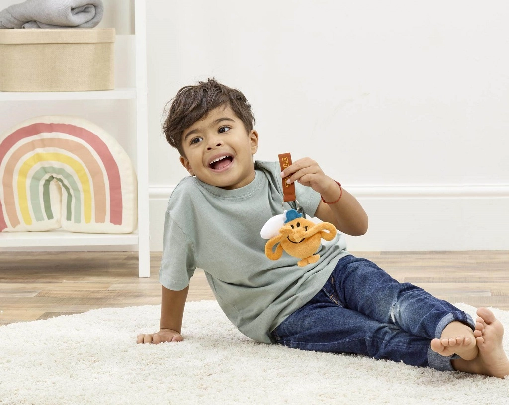 Miękki plusz jest przyjemny w dotyku, a wytrzymały metalowy karabińczyk zapewnia łatwe i bezpieczne przypięcie. Idealny dla dzieci od 18 miesięcy oraz dorosłych kolekcjonerów i fanów serii MR. MEN Rogera Hargreavesa.