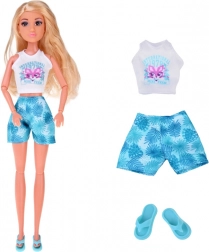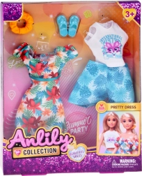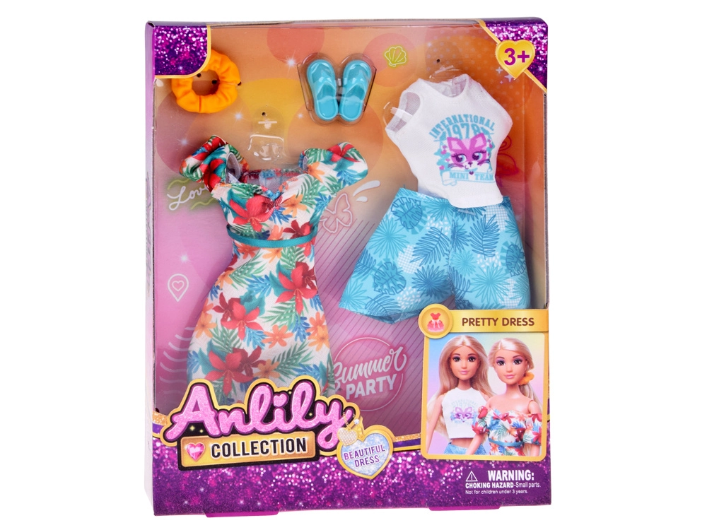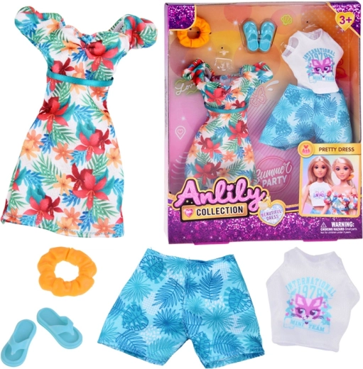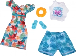 Zestaw oferuje dwie letnie stylizacje: lekką sukienkę w hawajskie kwiaty idealną na spacery po plaży oraz białe crop top i szorty z motywem liści na wygodne, pełne przygód dni. Doskonałe do kreatywnej zabawy, przebieranek i opowiadania wakacyjnych historii.