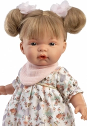 Joelle to starannie wykonana lalka z realistycznymi detalami – delikatnie rzeźbioną twarzą, rzęsami i wyrazem, który dzieci pokochają. Dzięki miękkiemu bawełnianemu ciałku przyjemnie się ją nosi i przytula, a winylowe ręce, nogi i głowa zapewniają trwałość oraz wierny wygląd. Po wyjęciu smoczka lalka wydaje dźwięk płaczu, co wspiera opiekuńcze umiejętności i wyobraźnię.