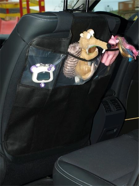Uczyń podróżowanie z dziećmi przejrzystym i wygodnym. Dziecięcy organizer samochodowy mocuje się za pomocą sznureczka w górnej części oraz elastycznej gumki na dole, dzięki czemu stabilnie trzyma się na oparciu przedniego fotela i chroni je przed brudem oraz śladami obuwia. Trzy przezroczyste, wzmocnione kieszenie pozwalają szybko znaleźć ulubione zabawki, książeczki, chusteczki lub butelkę.