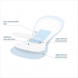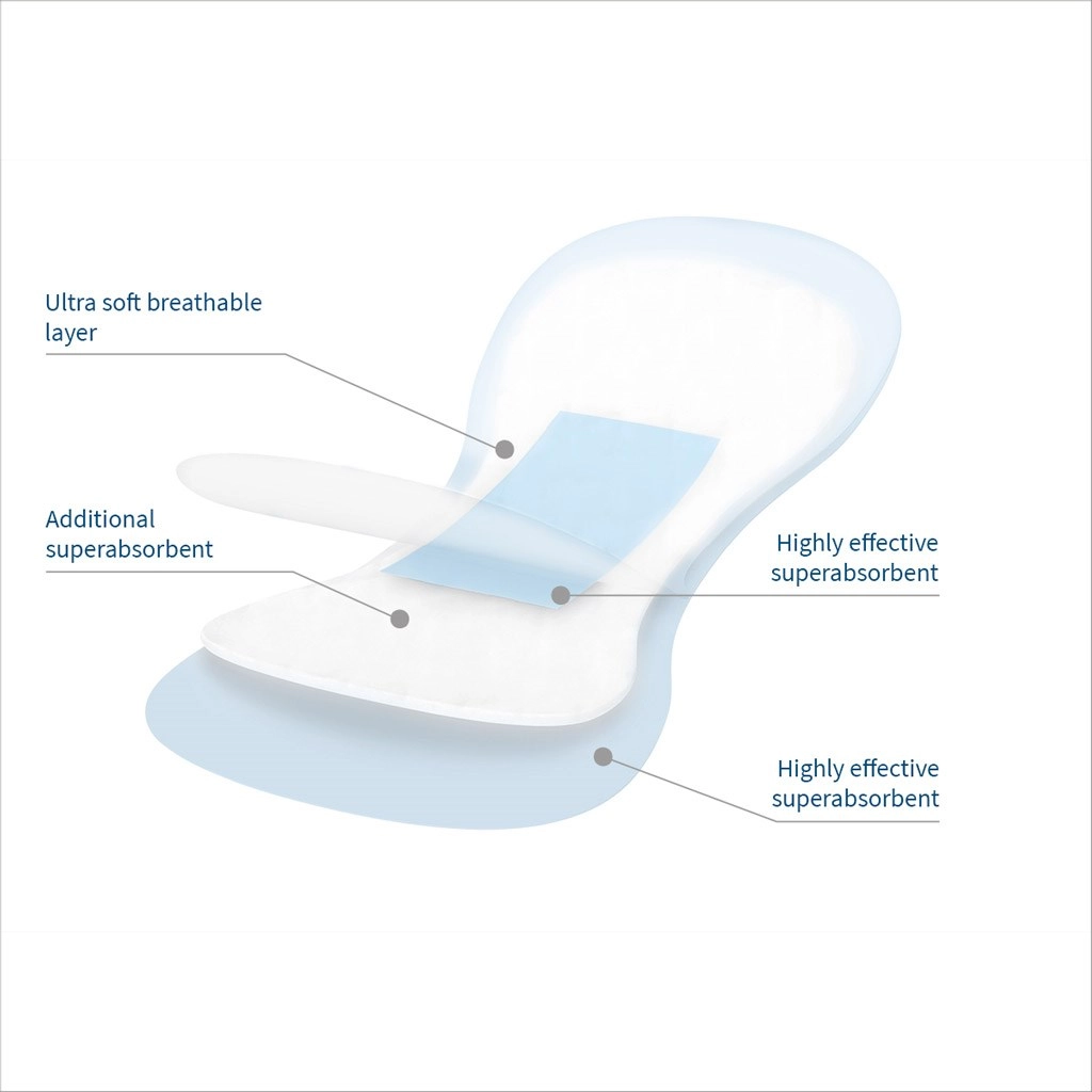 Specjalna pofalowana powierzchnia równomiernie rozprowadza płyn, dzięki czemu wkładka nie przykleja się do skóry i minimalizuje podrażnienia. Zewnętrzna warstwa ochronna zapobiega przeciekaniu i chroni bieliznę przed zabrudzeniem, natomiast pasek samoprzylepny zapewnia stabilne mocowanie zarówno w ruchu, jak i podczas leżenia.