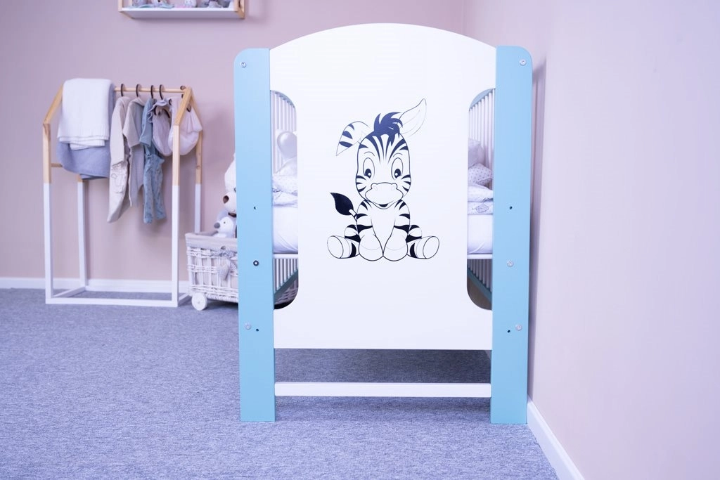 Praktyczne rozwiązania pozwalają ustawić stelaż w 3 pozycjach (22/38/51 cm) i skorzystać z trzech wyjmowanych szczebelków dla łatwiejszego dostępu do dziecka. Stelaż ze stabilnymi lamelami oraz wysokiej jakości klejone połączenia zapewniają wytrzymałość i długą żywotność. Dekoracyjny motyw zebry nadaje łóżeczku radosny wygląd, który świetnie wpasuje się w każdy pokój dziecięcy.