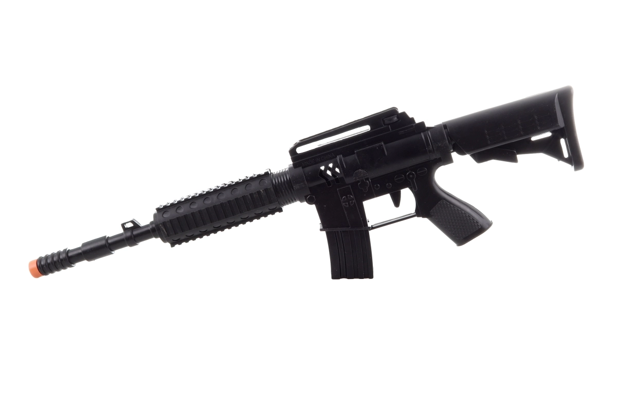 Karabin maszynowy z teksturowanymi detalami i pomarańczową końcówką bezpieczeństwa wygląda realistycznie, a jednocześnie jest odpowiedni do dziecięcej zabawy od 3 lat.