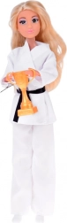 Białe kimono z czarnym pasem i złote trofeum dla zwyciężczyni. Lalka z przegubowymi ramionami potrafi przyjąć bojowe pozy i świętować sukces.