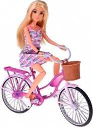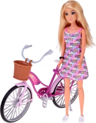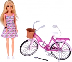 Lalka ok. 30 cm, sukienka, buty, zegarek, smartfon, kij do selfie, rower z koszykiem i uchwytem na lalkę