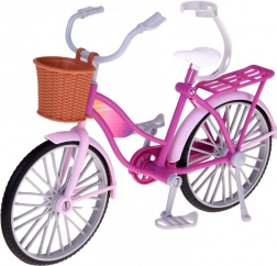Różowo‑fioletowy rower z przednim koszykiem, tylnym bagażnikiem, pedałami i kołami szprychowymi swobodnie się toczy i jest łatwy w prowadzeniu. Siodło z uchwytem stabilnie utrzymuje lalkę podczas „jazdy”.