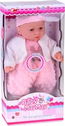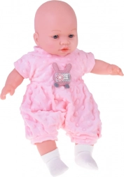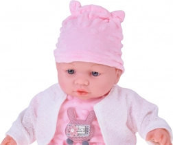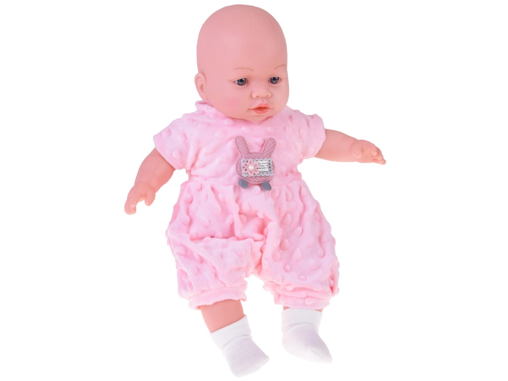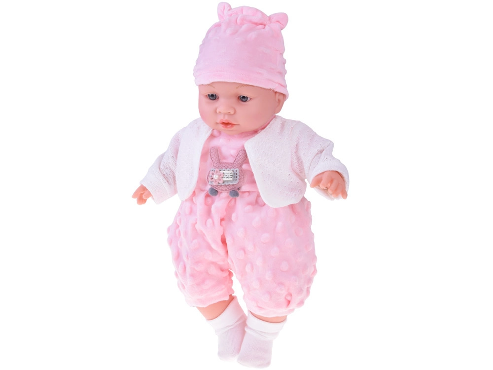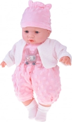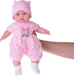 Uroczy bobas o wysokości 40 cm ucieszy każde dziecko już od 12 miesięcy. Dzięki miękkiemu, tekstylnemu brzuszkowi świetnie się przytula, jest lekki do noszenia i ma realistyczne detale twarzy. Po naciśnięciu brzuszka wydaje różne dźwięki – gaworzy, śmieje się, popłakuje i mruczy. W zestawie znajduje się miękki różowy rampers z minky z aplikacją, czapeczka z uszkami, biały kardigan i skarpetki.