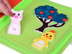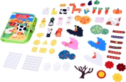 Dzieci poznają zwierzęta gospodarskie, kolory, kształty i rośliny uprawne. Przenosząc elementy, tworzą własne scenki i rozwijają słownictwo oraz wyobraźnię.
