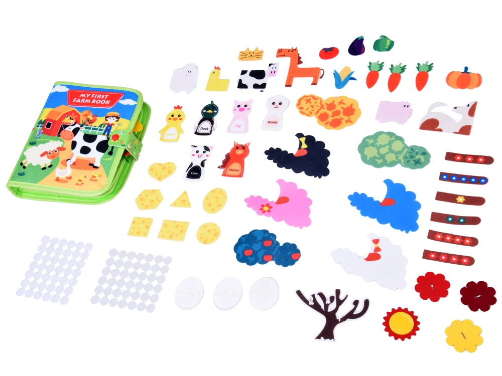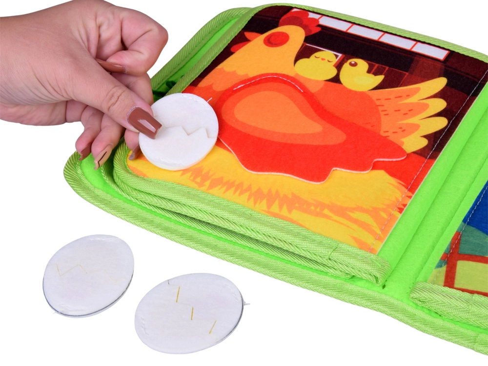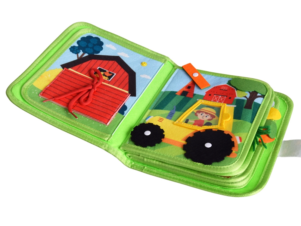 Ta tekstylna sensoryczna książeczka o tematyce farmy zapewnia dzieciom godziny twórczej zabawy. Na każdej stronie czekają zwierzątka, warzywa, traktor i stodoła, które można przemieszczać i łączyć dzięki rzepom. Dzieci mogą podnosić okienka, obracać koła traktora, wiązać sznurowadło i odkrywać, co kryje się na farmie.
