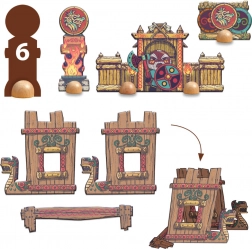 Bramy, tarcze, paleniska i motywy okrętów złożysz jako przeszkody lub cele. Kolorowy nadruk i stabilne łączniki wspierają kreatywną zabawę.