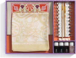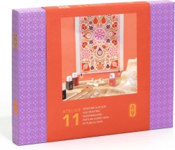 Opakowanie zawiera farby do tkanin, pędzle, klipsy, miseczkę na farbę, szablon oraz jedwabny szalik. Wystarczy rozpakować i zacząć malować.