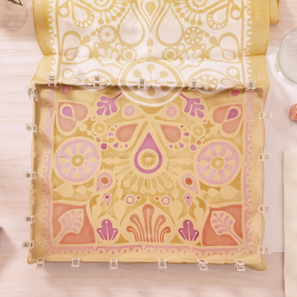 Jedwabny szalik, farby do tkanin, 2 pędzle, klipsy do mocowania, miseczka na farbę, szablon/motyw
