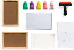 Praktycznie skomponowany zestaw z płytą żelową, wałkiem, pięcioma farbami i papierami pozwoli zacząć tworzyć od razu po rozpakowaniu.
