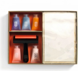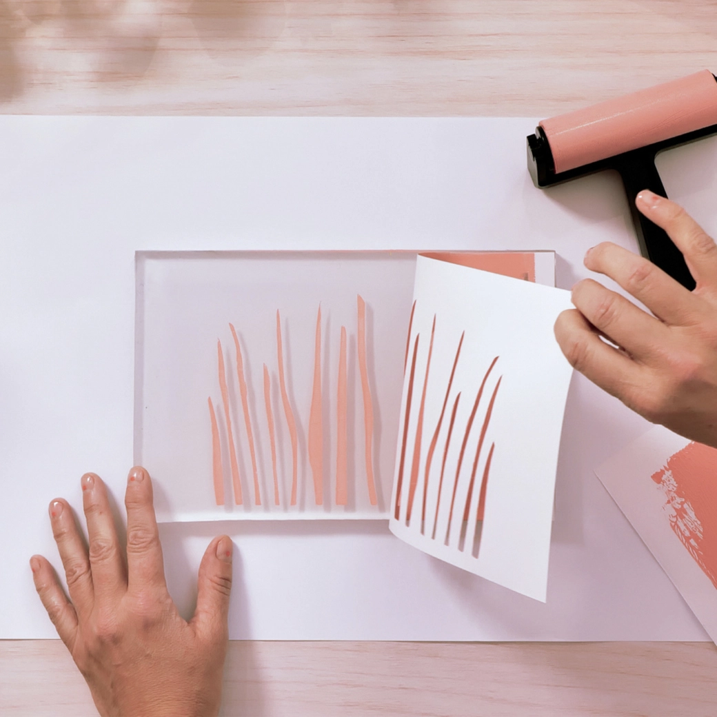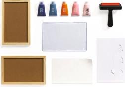 Wszystko, czego potrzebujesz do pierwszego druku: płyta żelowa, brayer, farby, papiery i szablony. Otwórz pudełko i twórz – bez dodatkowych akcesoriów.