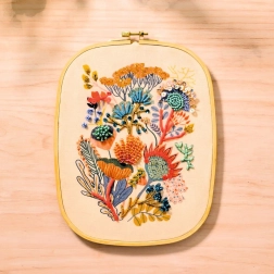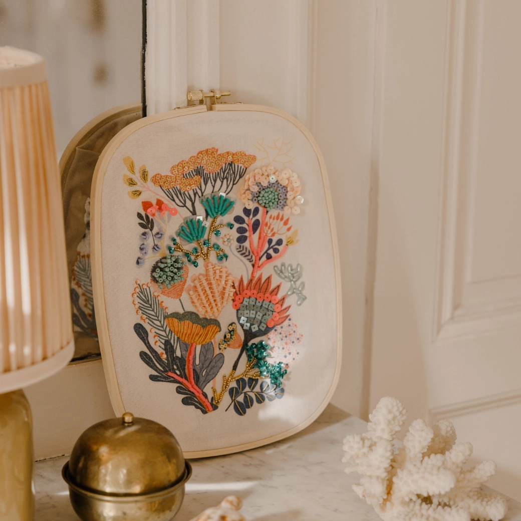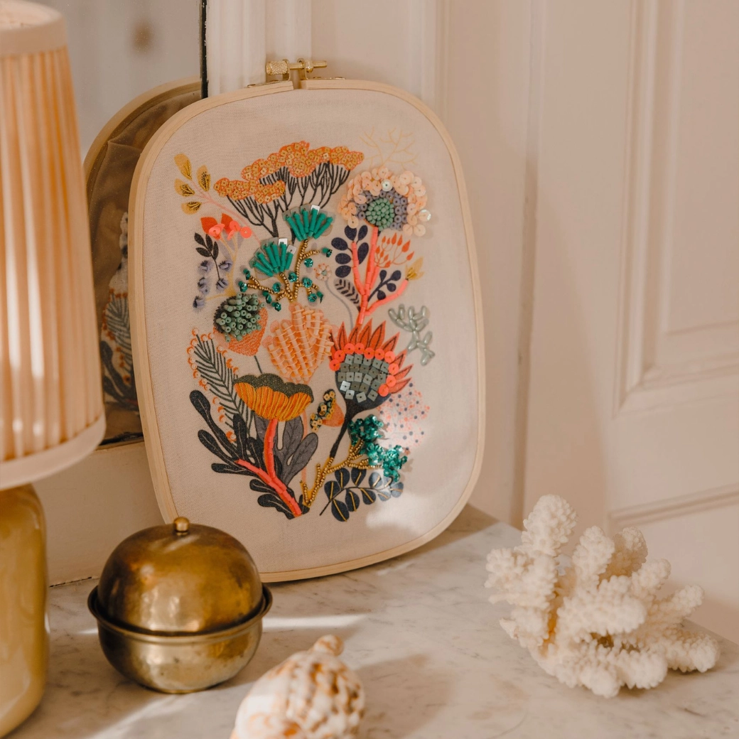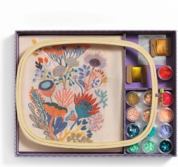 Ten kreatywny zestaw do haftu koralikowego zawiera wszystko, czego potrzebujesz, aby stworzyć piękny kwiatowy motyw: drewnianą ramkę do haftu, zadrukowaną tkaninę, muliny, igły, wybór błyszczących koralików i cekinów oraz praktyczne dodatki do czystego wykończenia. Jest idealny dla początkujących i zaawansowanych – proces jest intuicyjny i nagradza wyrafinowanym, lśniącym efektem odpowiednim do powieszenia na ścianie.