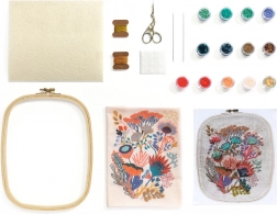 Kompletny zestaw z drewnianą ramką, zadrukowaną tkaniną, nićmi, igłami i koralikami. Otwórz pudełko i zaczynaj.