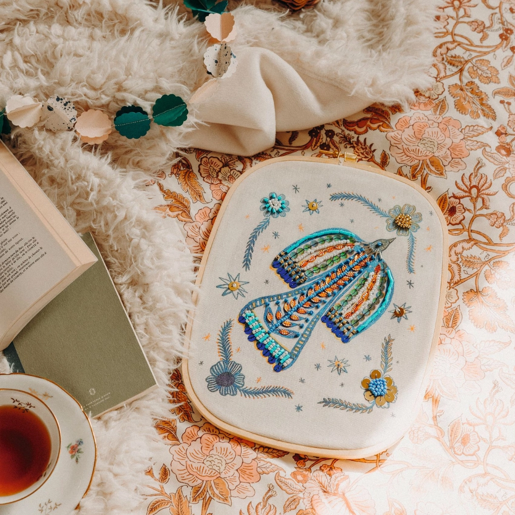 Drewniany tamborek, drukowana tkanina z motywem, kolorowe nici, koraliki i drobne akcesoria – przygotowane do natychmiastowego tworzenia bez szukania dodatkowych przyborów.