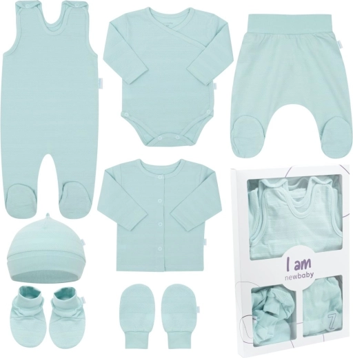 Kompletny zestaw dla noworodka NEW BABY I AM w delikatnym miętowym kolorze, z miękkiej 100% bawełny przyjaznej dla wrażliwej skóry dziecka. Zawiera body na napy, śpioszki, półśpioszki, kaftanik oraz czapeczkę. Łatwe ubieranie dzięki praktycznemu zapięciu na napy, komfort zapewnia oddychający materiał i szerokie ściągacze. Idealny do szpitala i na co dzień, świetnie sprawdzi się także jako prezent.