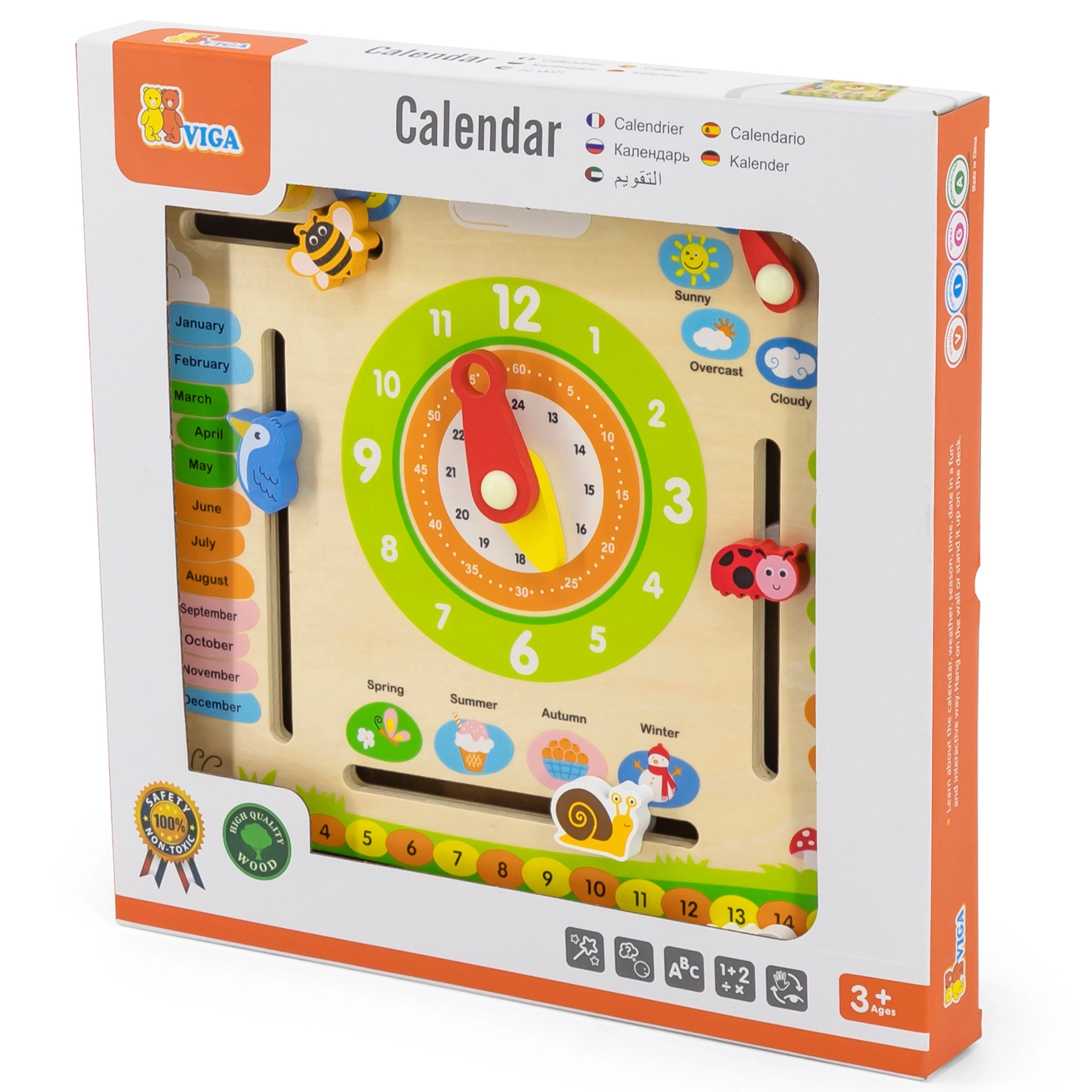Edukacyjny kalendarz VIGA to idealna pomoc dla dzieci do nauki o czasie, zmianach pogody i porach roku. Dzięki kolorowym i ruchomym elementom pomaga na co dzień zrozumieć pojęcie czasu.