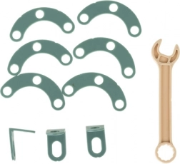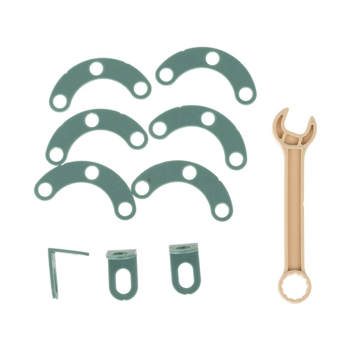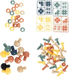 Plastikowe śrubki i nakrętki, kolorowe elementy konstrukcyjne, karty do budowania, pasek do noszenia