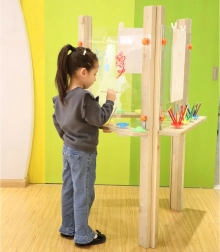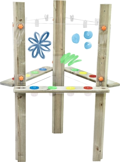 Ta solidna stacja plastyczna do użytku na zewnątrz i wewnątrz umożliwia malowanie bezpośrednio na przezroczystych panelach lub na papierze mocowanym klipsami. Dzięki trójkątnemu rzutom mogą wygodnie tworzyć trzy dzieci jednocześnie, nie przeszkadzając sobie nawzajem. Przezroczyste płyty akrylowe łatwo się czyści, co oszczędza czas i materiały.
