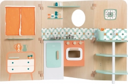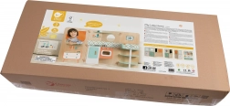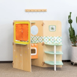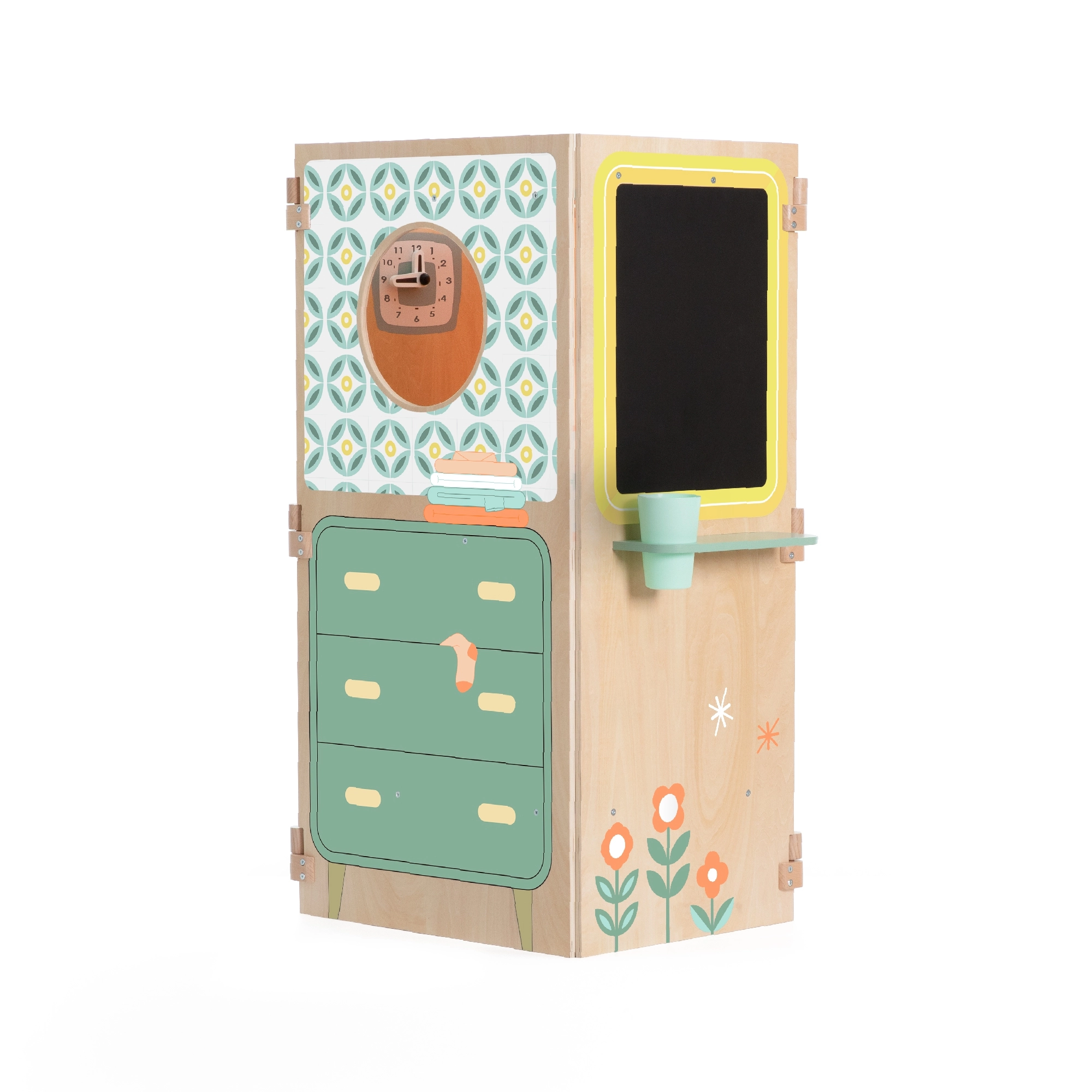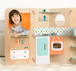 Domek łatwo rozkłada się na strefy zabawy i równie łatwo składa do kompaktowej formy, dzięki czemu idealnie sprawdzi się w mniejszych pokojach. Bogaty zestaw akcesoriów (garnki, filiżanki, sztućce, sól i pieprz) wspiera zabawę w role, interakcje społeczne i rozwój umiejętności.
