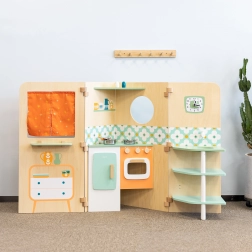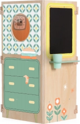 - Wielofunkcyjna zabawa: kuchenka, pralnia, okienko do teatrzyku i tablica
