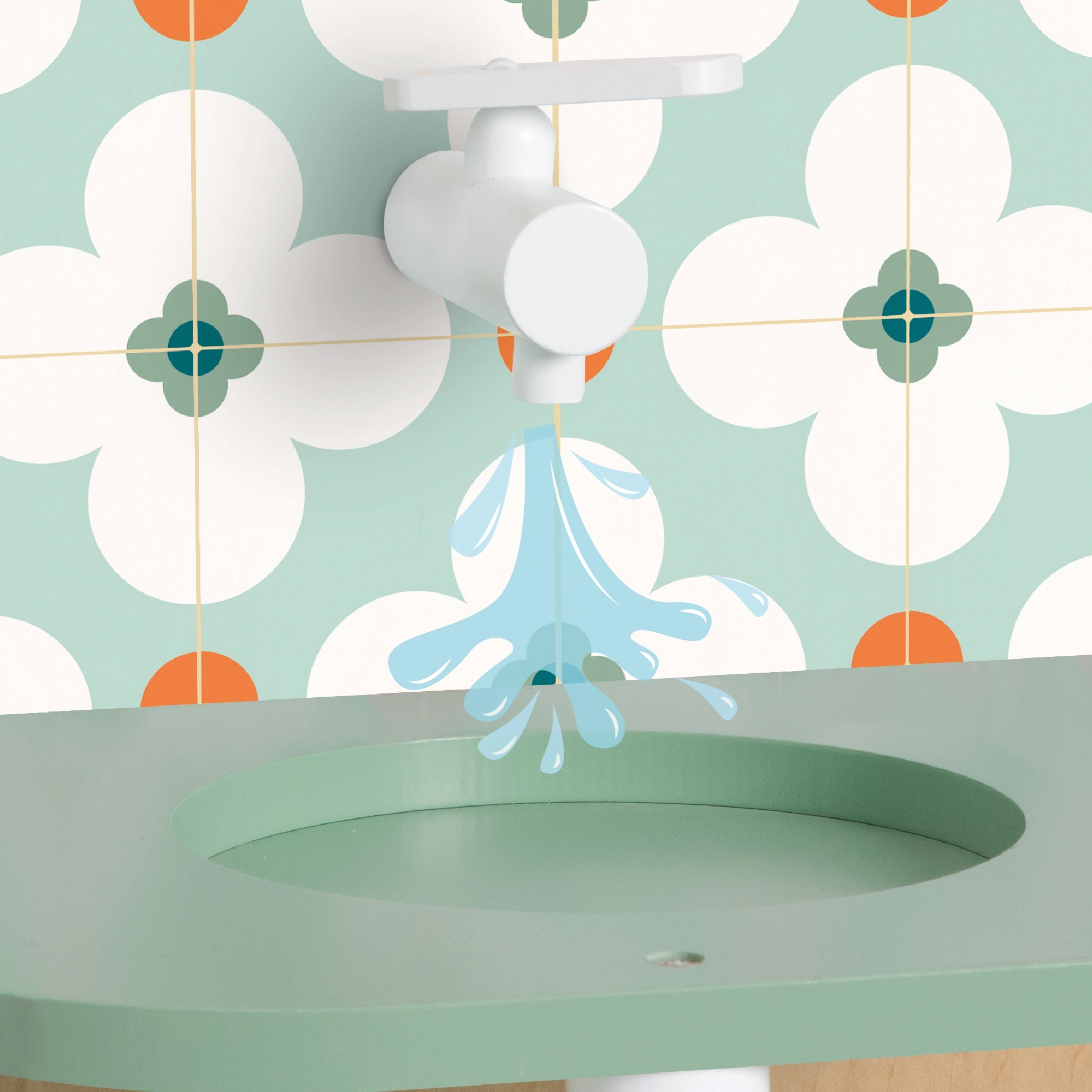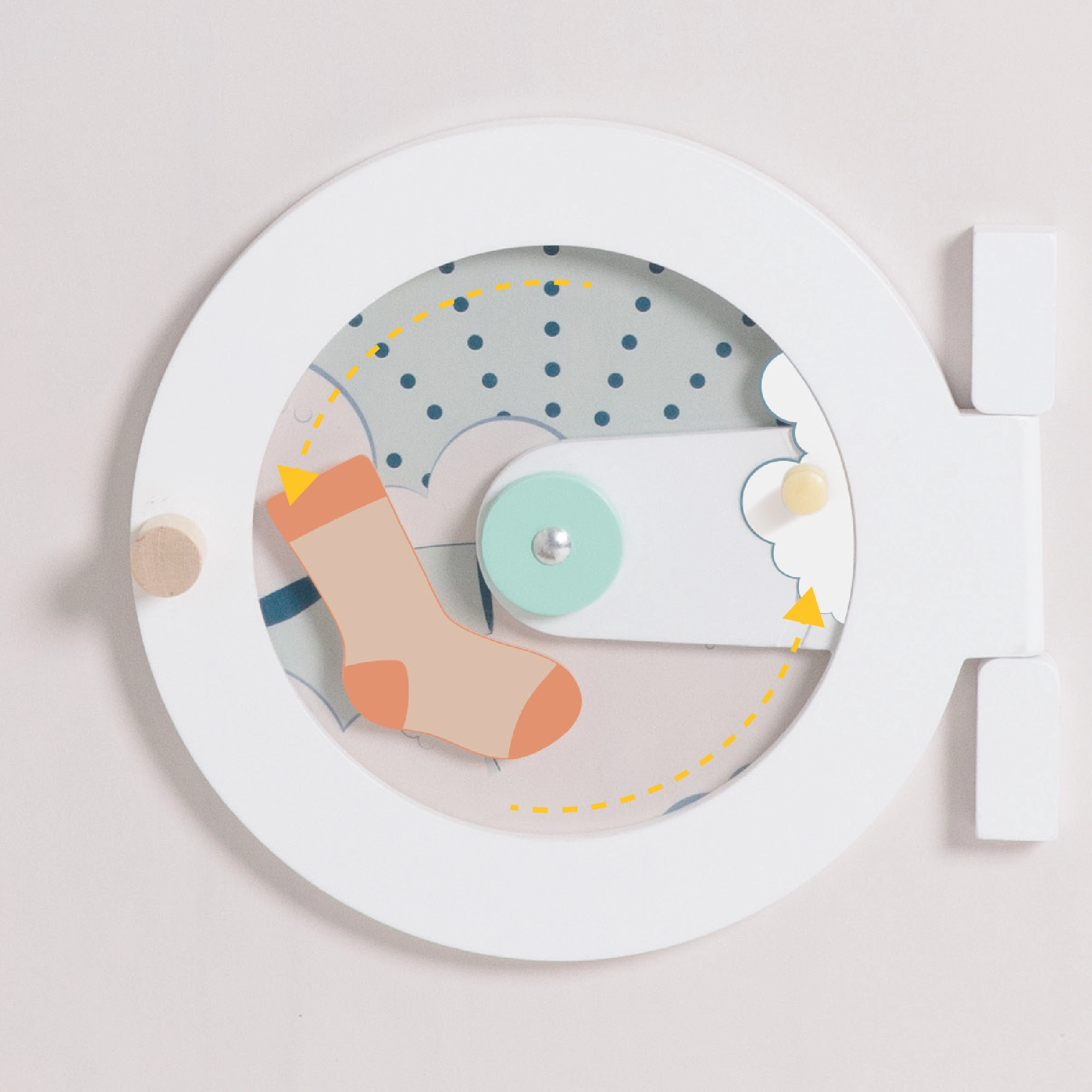 Wbudowana „pralka” z okrągłym okienkiem i elementami sterującymi poszerza tematy zabawy – od prania po sortowanie ubrań i dbanie o dom.