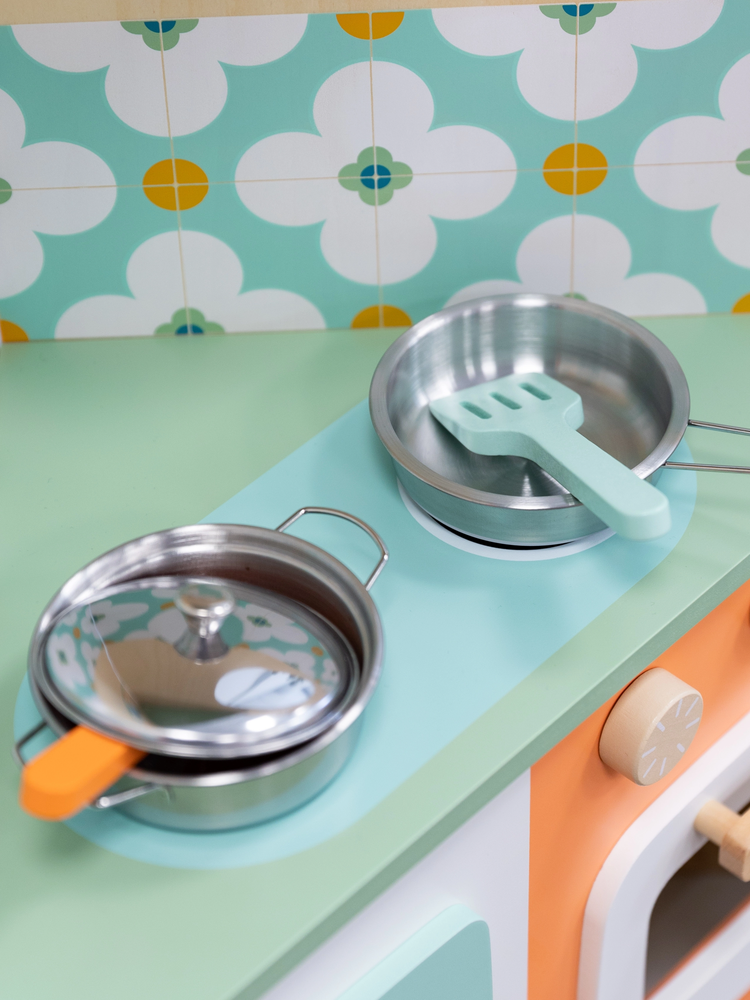 Dzieci mogą „gotować”, piec i obsługiwać za okienkiem. Otwierane drzwiczki, obrotowe pokrętła i półeczki wspierają realistyczną zabawę oraz organizację akcesoriów.