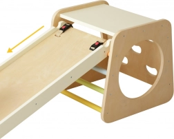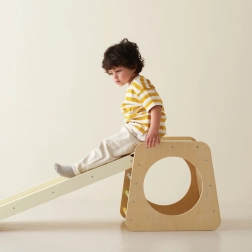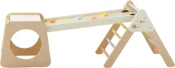 Ten wielofunkcyjny zestaw 5 w 1 łączy trójkątną konstrukcję wspinaczkową, dwustronną rampę/zjeżdżalnię oraz elementy do mostku i tunelu. Dzieci bezpiecznie ćwiczą motorykę dużą i małą, balans i orientację w przestrzeni, a solidna drewniana konstrukcja z gładką powierzchnią i zaokrąglonymi krawędziami zapewnia spokój rodzicom.