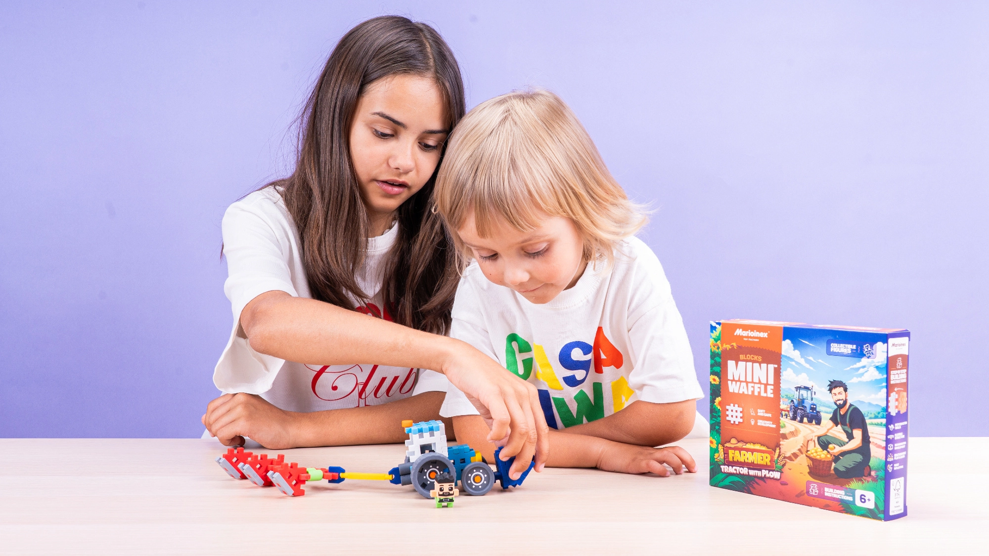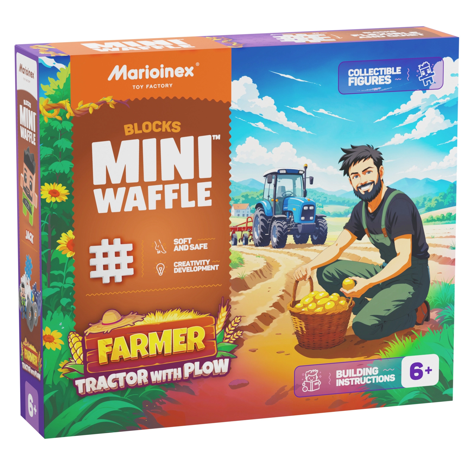 Odkryj kreatywny świat farmy z oryginalnymi klockami MINI WAFFLE FARMER. Z 50 kolorowych i elastycznych elementów zbudujesz traktor z pługiem, a dzięki figurce farmera stworzysz wiele scenariuszy zabawy. Klocki łatwo się łączą i rozłączają, są trwałe i bezpieczne, a także rozwijają kreatywność, małą motorykę oraz koordynację u dzieci od 6 lat.