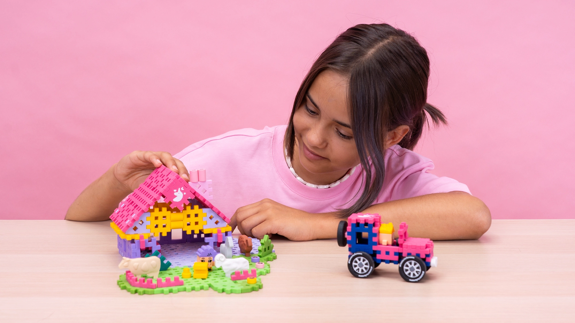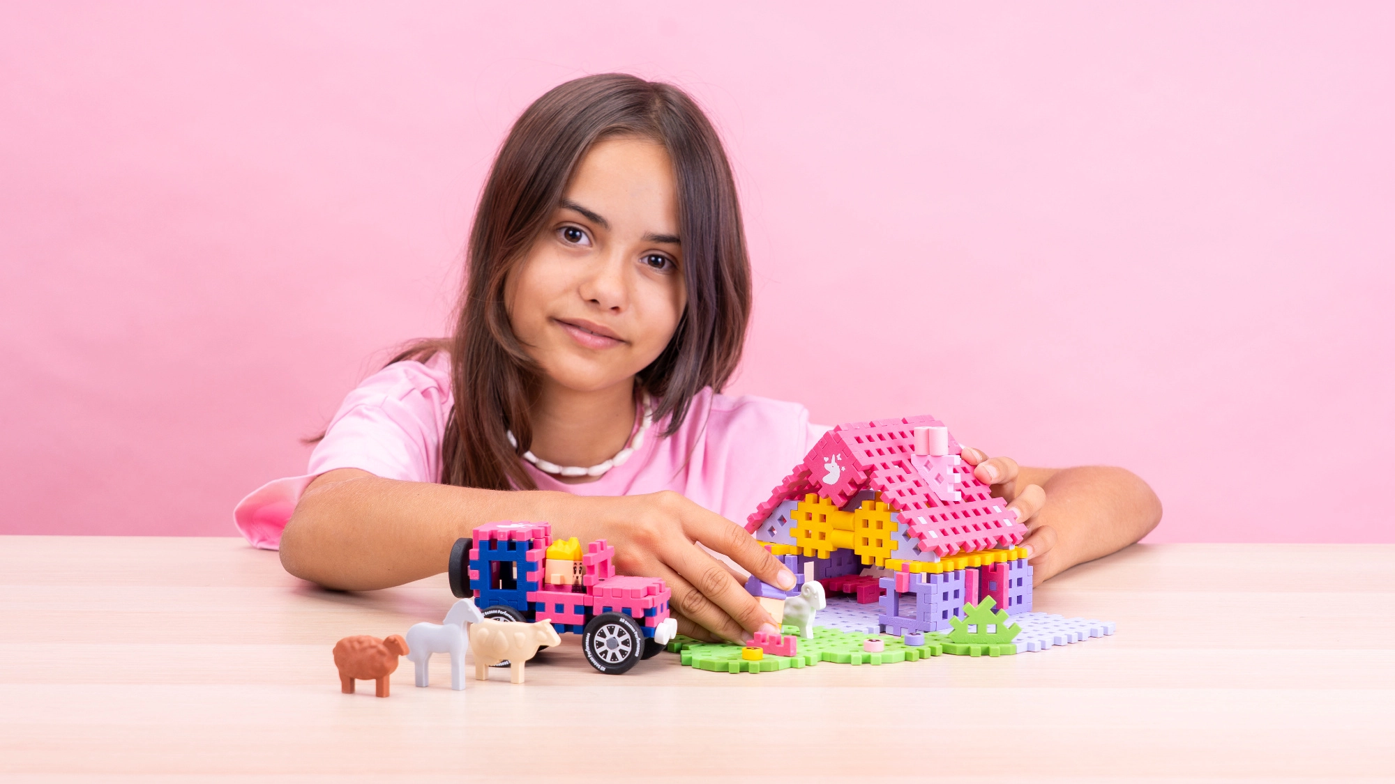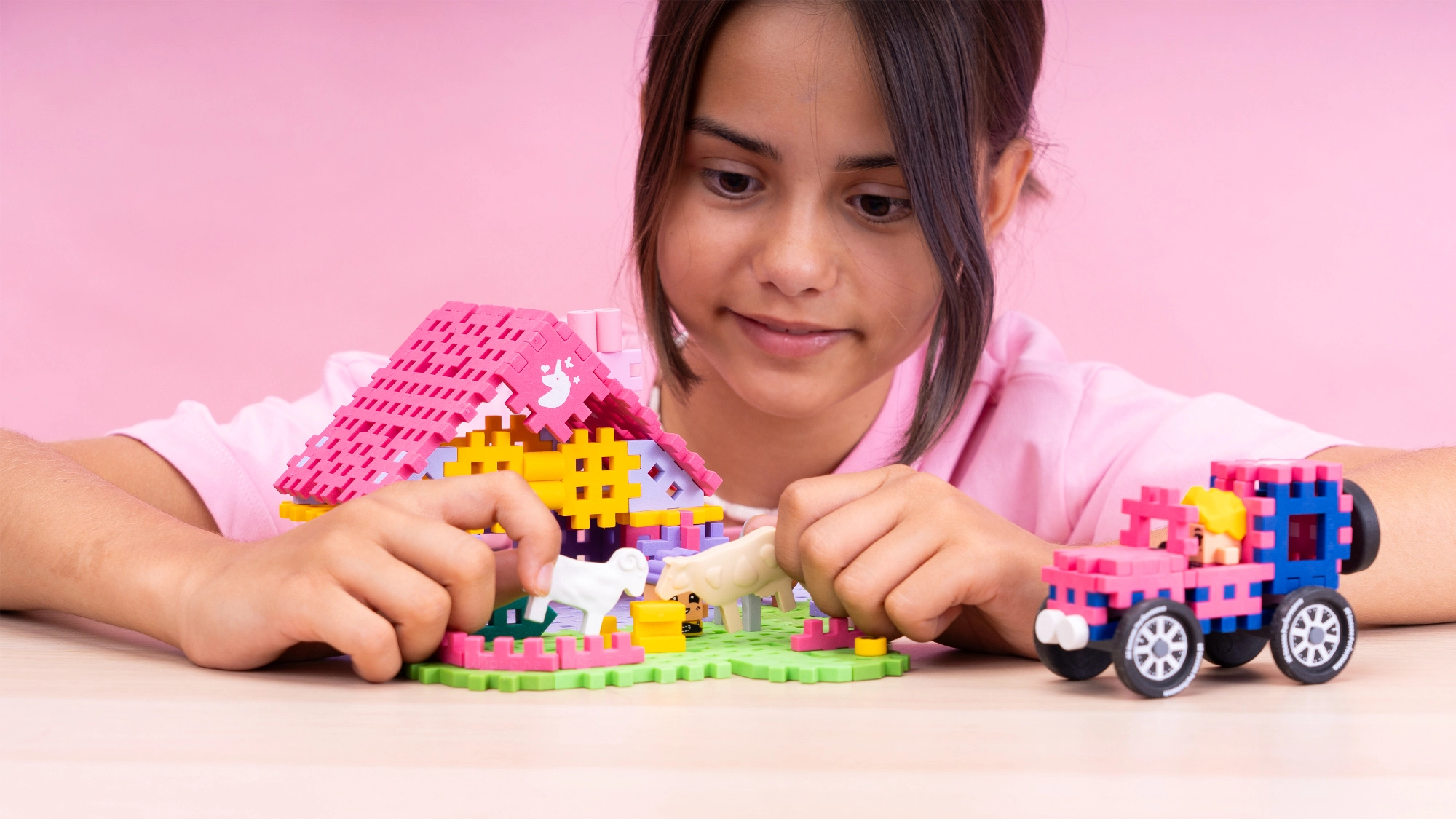Domek, zagrody, zwierzątka i detale krajobrazu – wszystko z kolorowych elementów Mini Waffle, które wspierają wyobraźnię i rozwój fantazji.