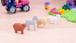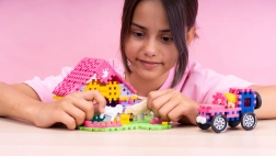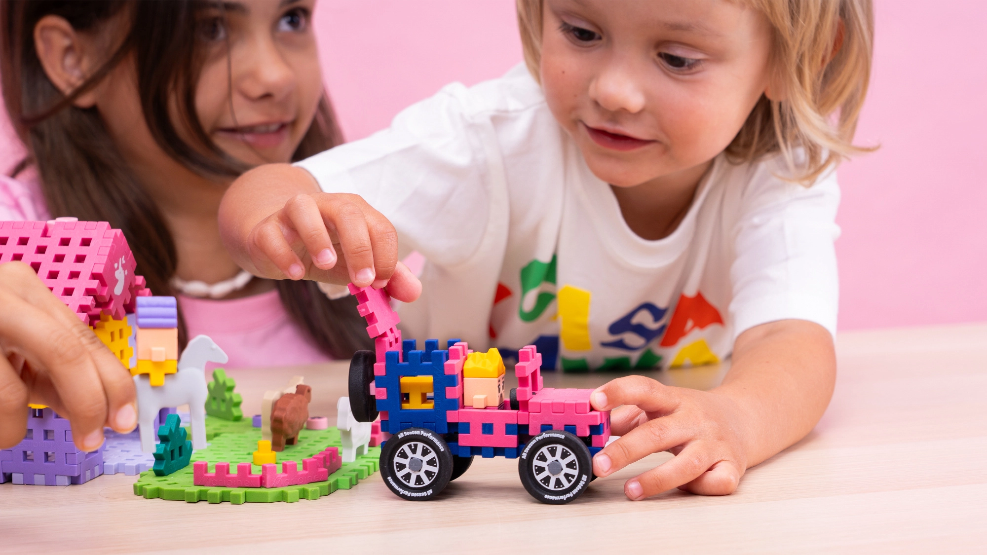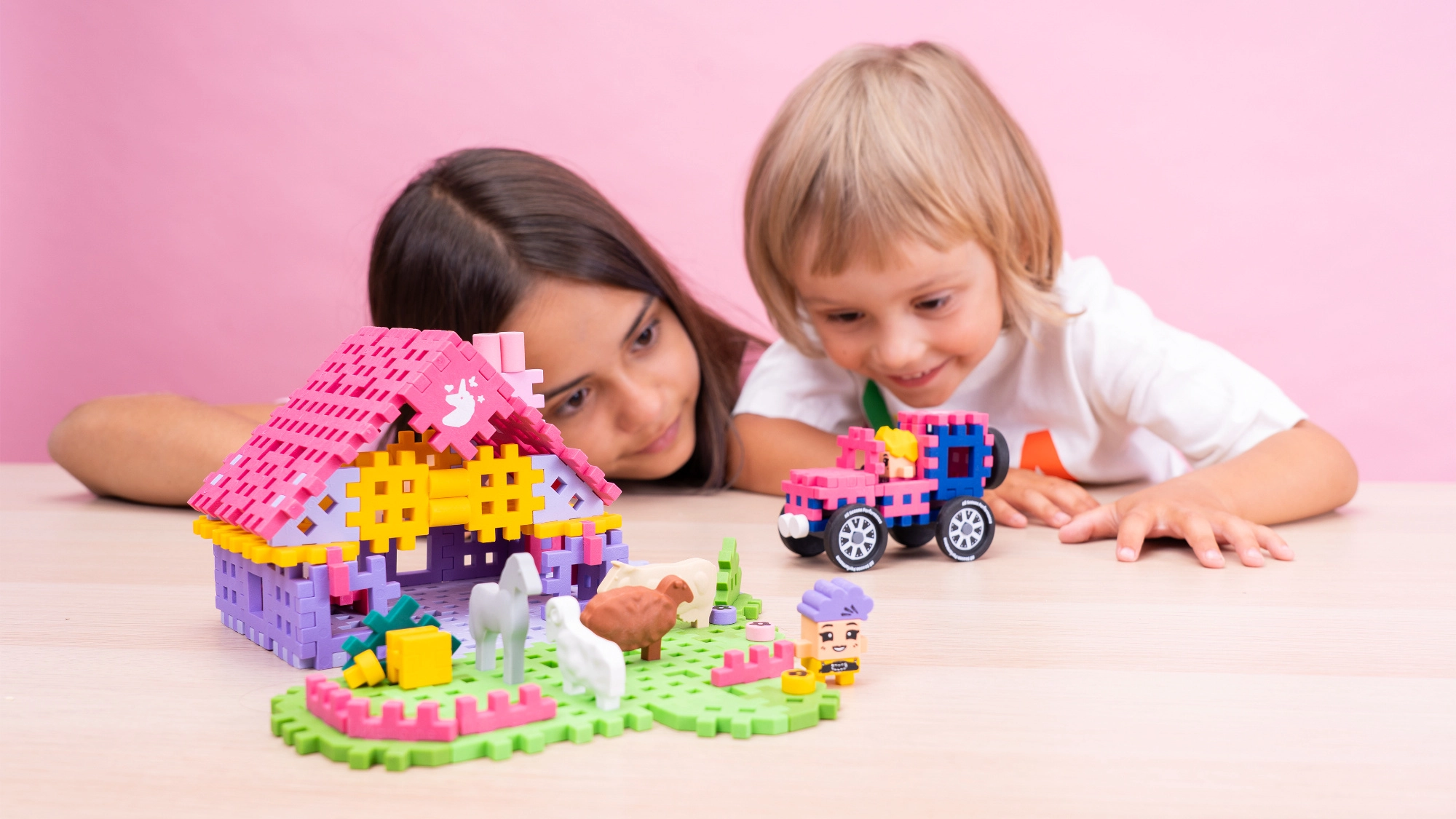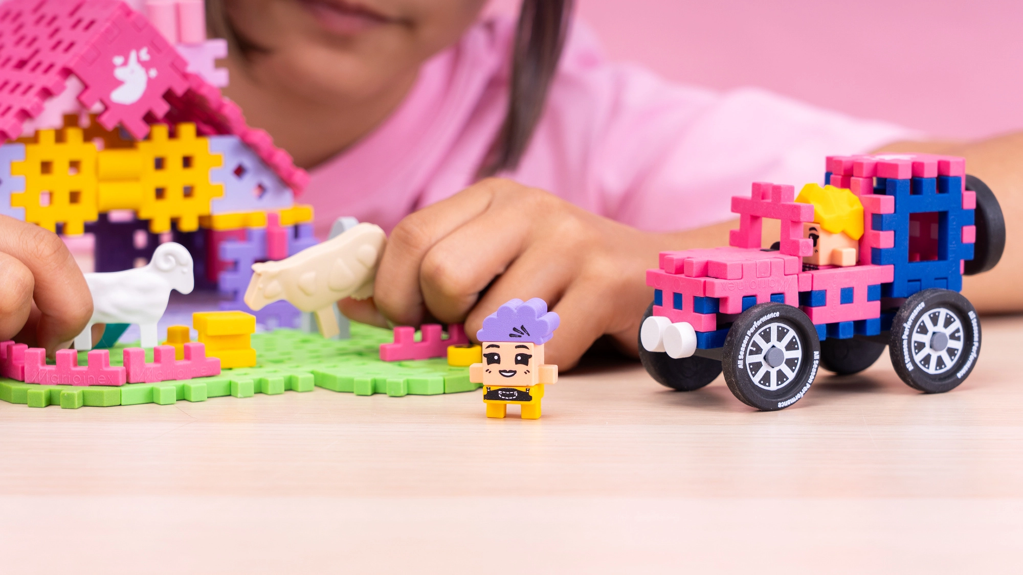Domek, zagrody, zwierzątka i detale krajobrazu – wszystko z kolorowych elementów Mini Waffle, które wspierają wyobraźnię i rozwój fantazji.