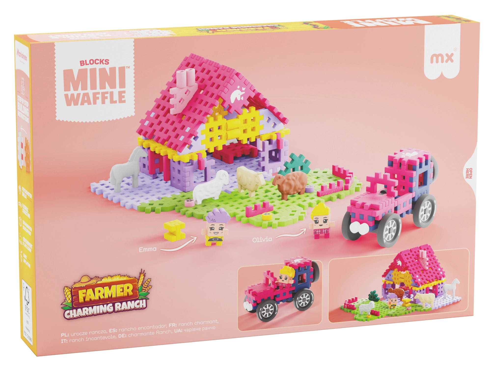 Ten zestaw z serii Mini Waffle przenosi dzieci w spokojny, farmerski świat pełen zwierzątek, domku i małego pojazdu. Elementy są miękkie, wytrzymałe i bezpieczne, doskonale się łączą i ponownie rozdzielają, dzięki czemu dzieci mogą wciąż na nowo tworzyć budowle i scenariusze.