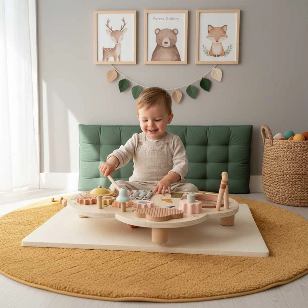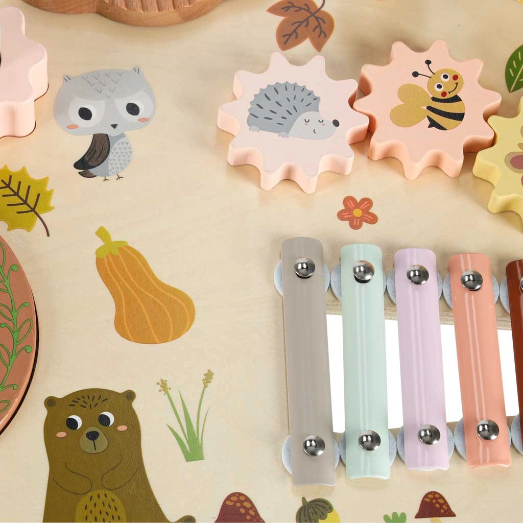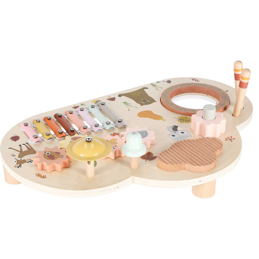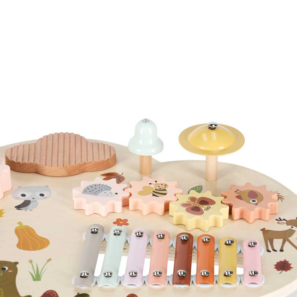 Niskie nóżki i solidny blat z naturalnego drewna zapewniają stabilność przy uderzaniu, kręceniu i klaskaniu – idealne dla maluchów.